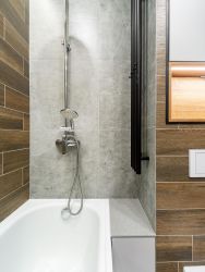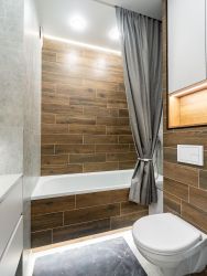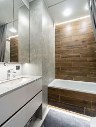Ванная комната с новой сантехникой и дизайнерской отделкой — сочетание плитки под дерево и бетона, скрытый инсталляционный блок, встроенная подсветка.