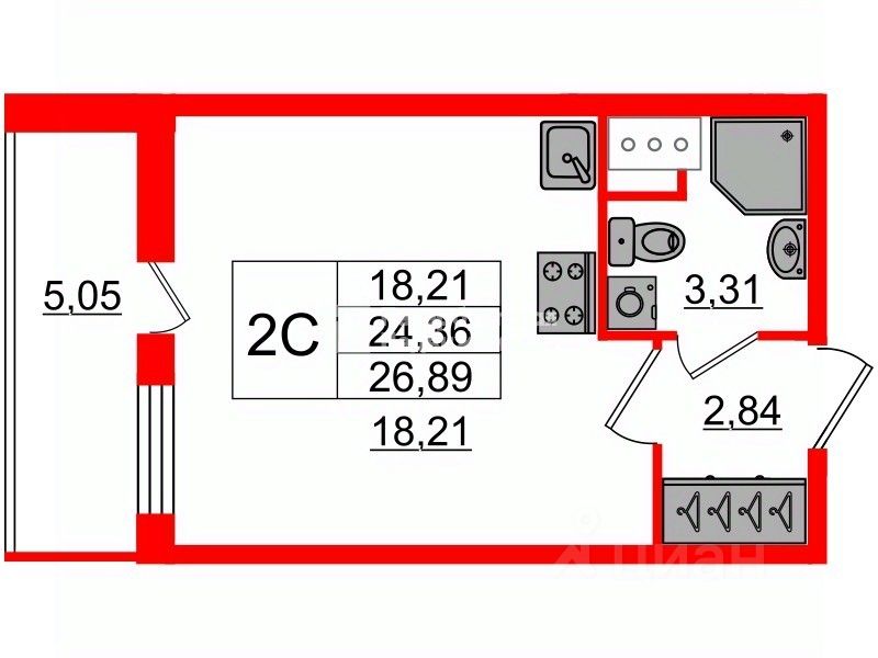 Совмещенный санузел 3,32м2.