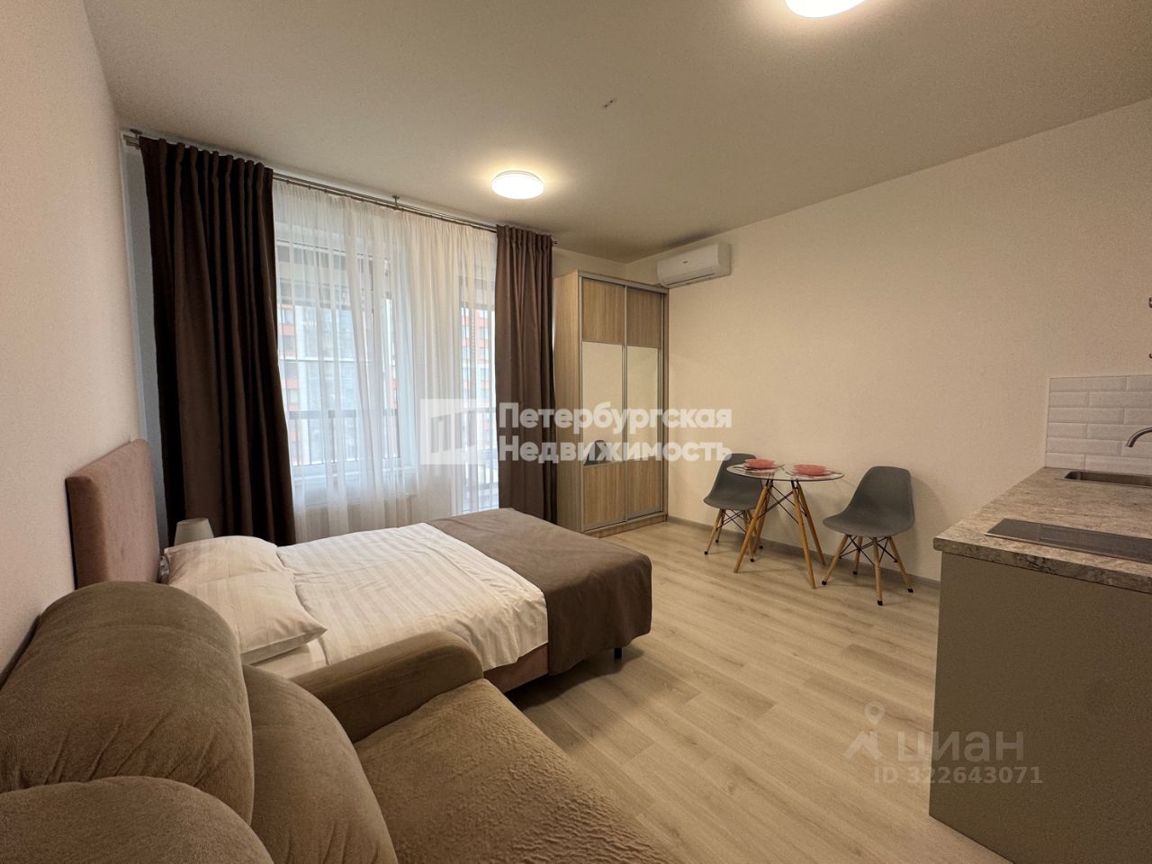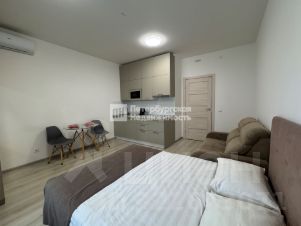 В комнате установлен кондиционер, встроенная кухня с техникой. Зеркальный шкаф, двухспальная кровать , диван.