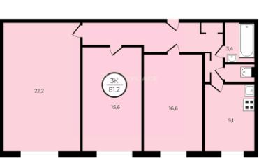 Общая площадь квартиры составляет 81,3 кв. м, из которых 54,4 кв. м — жилая площадь. Три изолированные комнаты (16,6 + 15,6 + 22,2 кв. м) идеально подойдут для семьи, где у каждого будет личное пространство