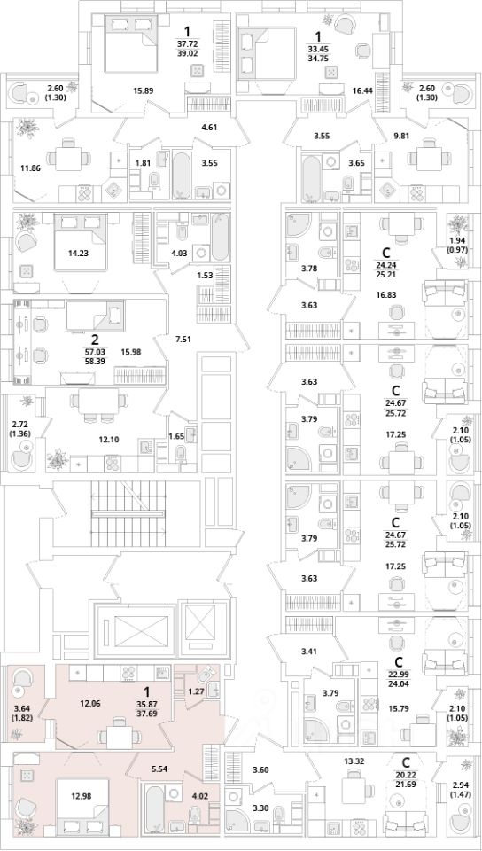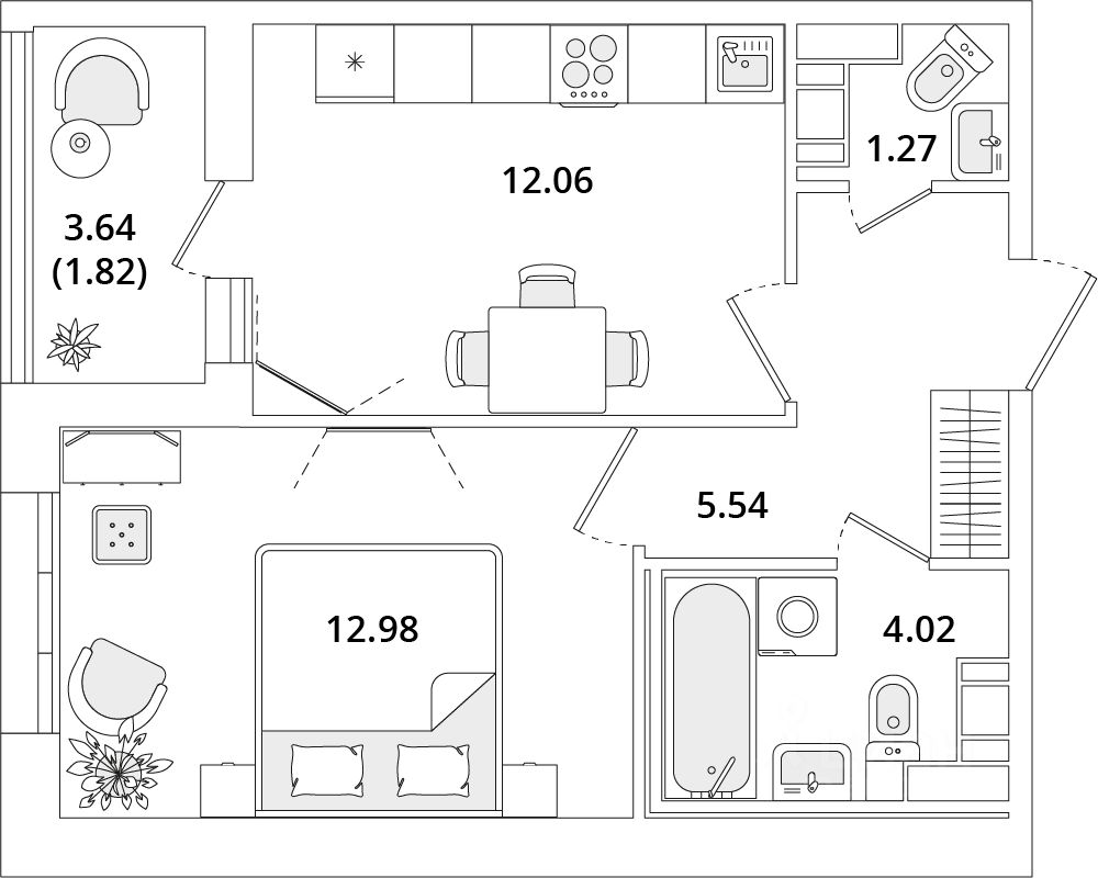 Квартира находится в 16 этажном доме, в Корпус 1-Cube на 12 этаже. Общая площадь квартиры 38,00 кв.м.