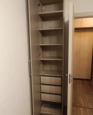 Предусмотрено достаточно много места для хранения вещей в виде просторной стенки из шкафов ИКЕА и антресолей третьего ряда на кухне.