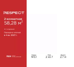 Продается двухкомнатная квартира с отделкой в ЖК "RESPECT" на 2 этаже. Общая площадь: 58.28 кв.м., жилая: 26.06 кв.м., площадь просторной кухни-столовой: 14.97 кв.м. Квартира без проходных комнат, окна выходят нa три cтopoны дома. В квартире один балкон, один совмещенный и один раздельный санузел. Высота потолков 2.7 м.