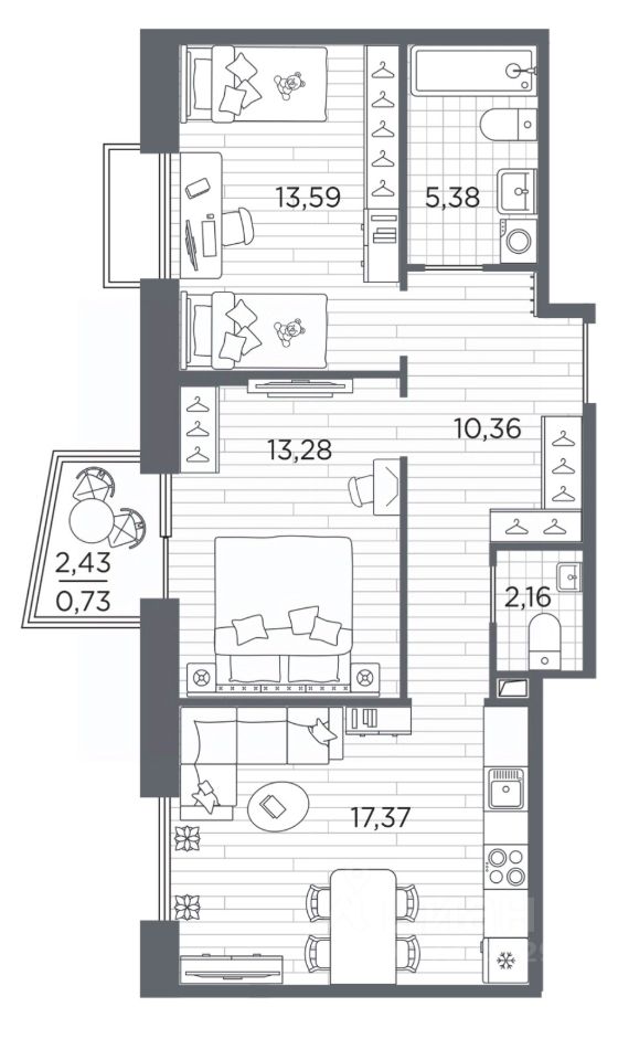 2-комн. квартира с предчистовой отделкой в ЖК "RESPECT" на 3 этаже. Общая площадь: 62.87 кв.м. Высота потолков 2.7 м.