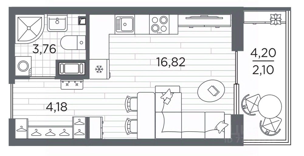 Просторная 1-комн. квартира-студия с предчистовой отделкой в ЖК "RESPECT" на 7 этаже. Общая площадь: 26.86 кв.м., площадь гостиной 16.82 кв.м., из которых 5 кв.м. выделено под кухонную зону. Все окна выходят на одну сторону. В квартире один балкон, один совмещенный санузел. Высота потолков 2.7 м.