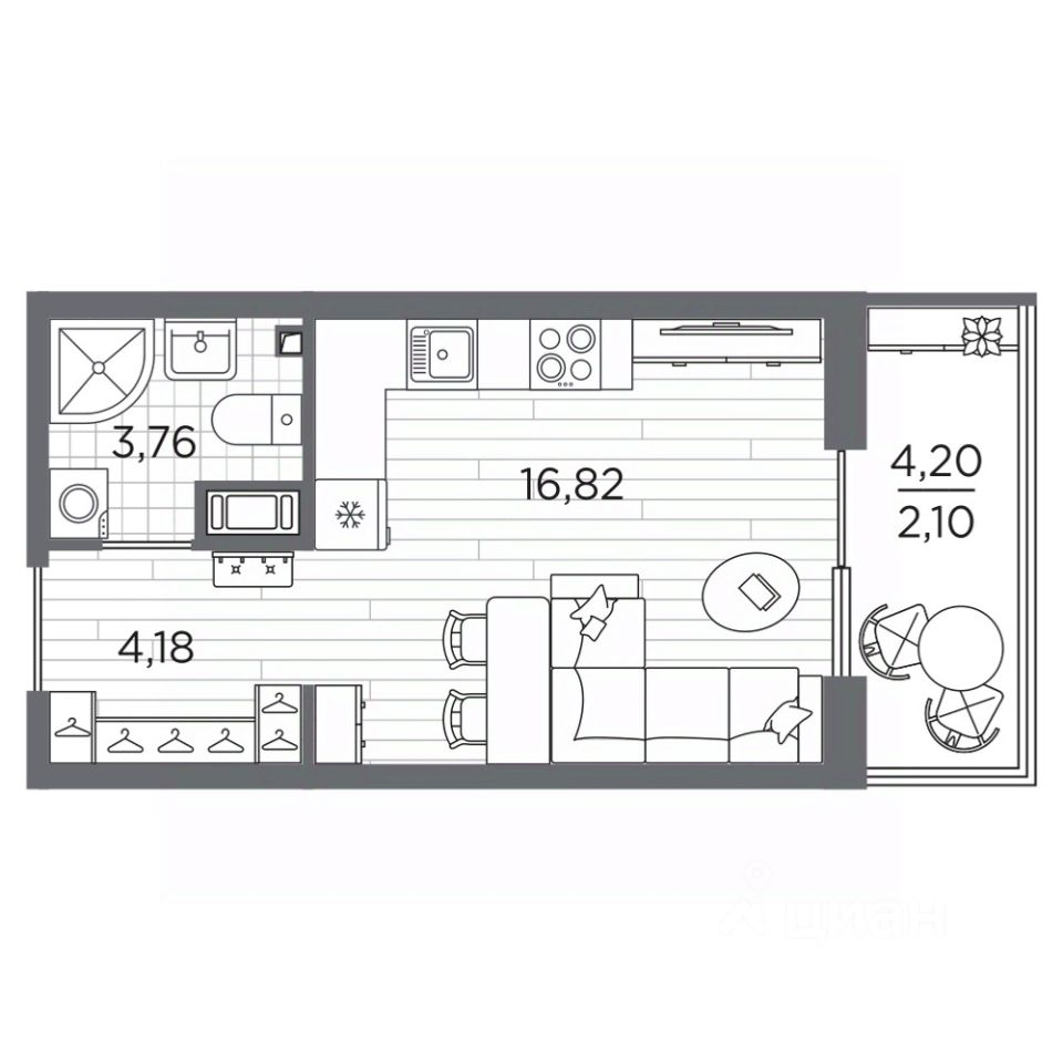 Просторная 1-комн. квартира-студия с предчистовой отделкой в ЖК "RESPECT" на 8 этаже. Общая площадь: 26.86 кв.м., площадь гостиной 16.82 кв.м., из которых 5 кв.м. выделено под кухонную зону. Все окна выходят на одну сторону. В квартире один балкон, один совмещенный санузел. Высота потолков 2.7 м.