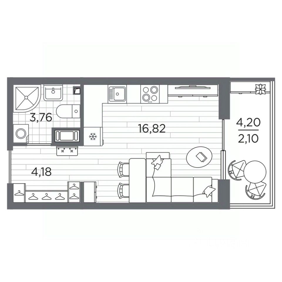 Однокомнатная квартира-студия от застройщика с предчистовой отделкой в ЖК "RESPECT" на 12 этаже. Общая площадь: 26.86 кв.м., площадь гостиной 16.82 кв.м., из которых 5 кв.м. выделено под кухонную зону. Все окна выходят на одну сторону. В квартире один балкон, один совмещенный санузел. Высота потолков 2.7 м.