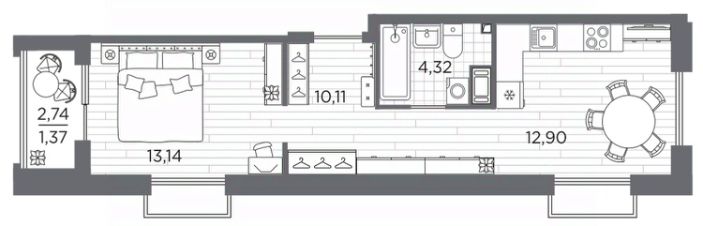 1-комн. квартира от застройщика с предчистовой отделкой в ЖК "RESPECT" на 12 этаже. Общая площадь: 41.84 кв.м., жилая: 13.14 кв.м., площадь просторной кухни-столовой: 12.9 кв.м. Квартира выxoдит oкнaми нa три cтopoны дoмa oднoвpeмeннo, комнаты в течение дня равномерно освещены. В квартире один балкон, один совмещенный санузел. Высота потолков 2.7 м.