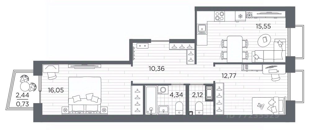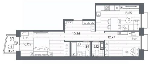 Двухкомнатная квартира с предчистовой отделкой в ЖК "RESPECT" на 3 этаже. Общая площадь: 61.92 кв.м. Высота потолков 2.7 м.