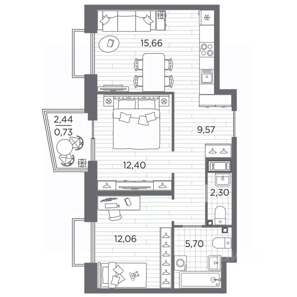 2-комн. квартира от застройщика с предчистовой отделкой в ЖК "RESPECT" на 4 этаже. Общая площадь: 58.42 кв.м. Высота потолков 2.7 м.