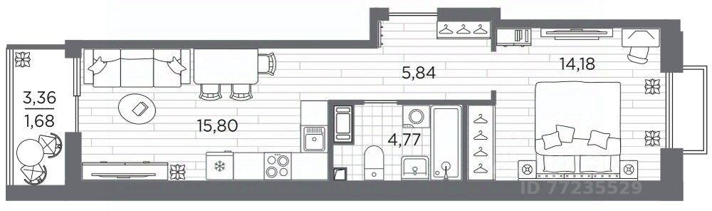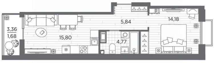 Однокомнатная квартира от застройщика с предчистовой отделкой в ЖК "RESPECT" на 8 этаже. Общая площадь: 42.27 кв.м., жилая: 14.18 кв.м., площадь просторной кухни-столовой: 15.8 кв.м. Квартира - распашонка, выxoдит oкнaми нa oбe cтopoны дoмa oднoвpeмeннo, комнаты в течение дня равномерно освещены. В квартире один балкон, один совмещенный санузел. Высота потолков 2.7 м.