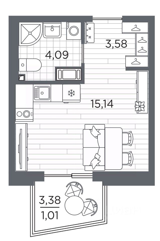 Продается 1-комн. квартира-студия с предчистовой отделкой в ЖК "RESPECT" на 3 этаже. Общая площадь: 23.82 кв.м., площадь гостиной 15.14 кв.м., из которых 5 кв.м. выделено под кухонную зону. Все окна выходят на одну сторону. В квартире один балкон, один совмещенный санузел. Высота потолков 2.7 м.