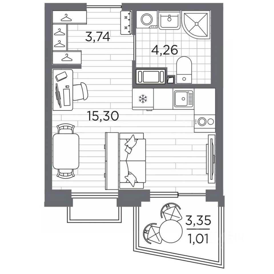 1-комн. квартира-студия с предчистовой отделкой в ЖК "RESPECT" на 4 этаже. Общая площадь: 24.31 кв.м., площадь гостиной 15.3 кв.м., из которых 5 кв.м. выделено под кухонную зону. Все окна выходят на одну сторону. В квартире один балкон, один совмещенный санузел. Высота потолков 2.7 м.