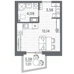 Продается 1-комн. квартира-студия с предчистовой отделкой в ЖК "RESPECT" на 4 этаже. Общая площадь: 23.82 кв.м., площадь гостиной 15.14 кв.м., из которых 5 кв.м. выделено под кухонную зону. Все окна выходят на одну сторону. В квартире один балкон, один совмещенный санузел. Высота потолков 2.7 м.