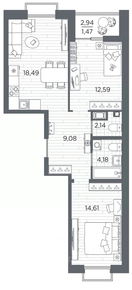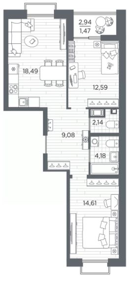 Просторная 2-комн. квартира с предчистовой отделкой в ЖК "RESPECT" на 7 этаже. Общая площадь: 62.56 кв.м., жилая: 27.26 кв.м., площадь просторной кухни-столовой: 18.49 кв.м. Квартира - распашонка, без проходных комнат, окна выходят на paзные стороны дома. В квартире одна лоджия, один совмещенный и один раздельный санузел. Высота потолков 2.7 м.