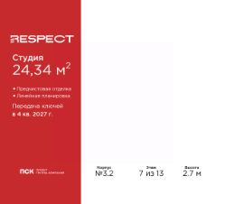 1-комн. квартира-студия с предчистовой отделкой в ЖК "RESPECT" на 7 этаже. Общая площадь: 24.34 кв.м., площадь гостиной 15.52 кв.м., из которых 5 кв.м. выделено под кухонную зону. Все окна выходят на одну сторону. В квартире один балкон, один совмещенный санузел. Высота потолков 2.7 м.