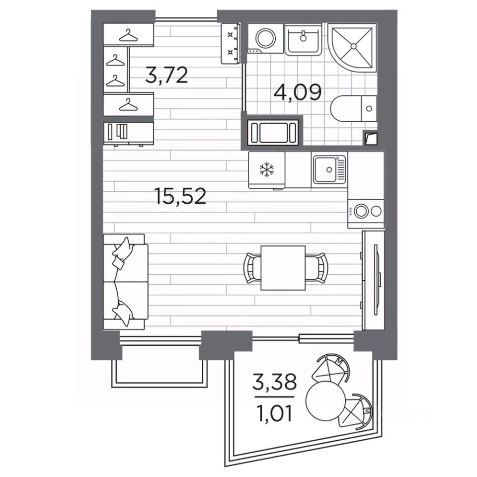 Просторная 1-комн. квартира-студия с предчистовой отделкой в ЖК "RESPECT" на 12 этаже. Общая площадь: 24.34 кв.м., площадь гостиной 15.52 кв.м., из которых 5 кв.м. выделено под кухонную зону. Все окна выходят на одну сторону. В квартире один балкон, один совмещенный санузел. Высота потолков 2.7 м.