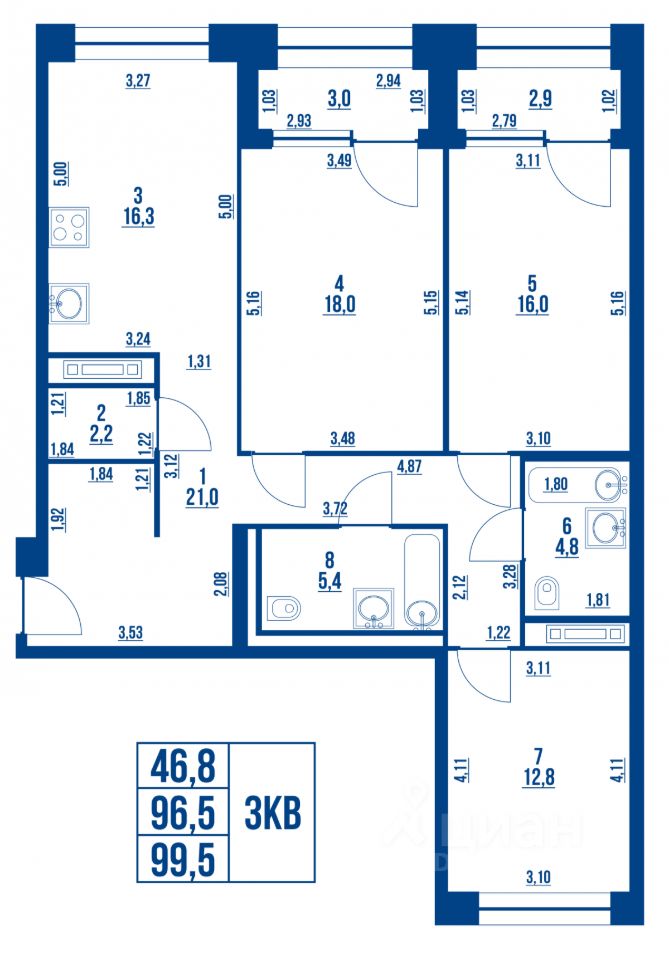Функциональная планировка с большой кухней 16.3м2 , двумя просторными санузлами, большой прихожей и 3-мя спальнями создает возможности для реализации любых Ваших проектов.