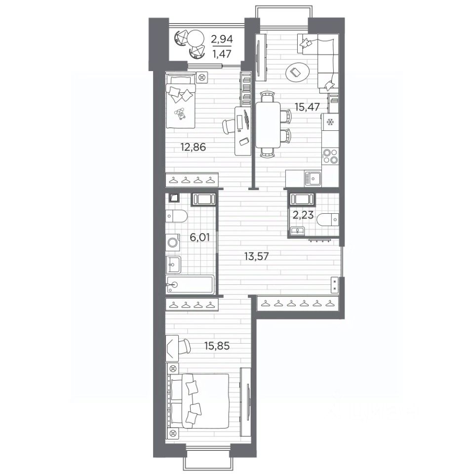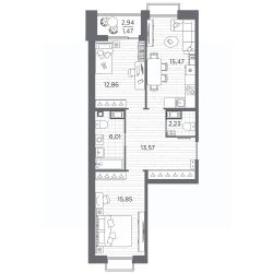Просторная двухкомнатная квартира с предчистовой отделкой в ЖК "RESPECT" на 4 этаже. Общая площадь: 67.46 кв.м., жилая: 28.71 кв.м., площадь просторной кухни-столовой: 15.47 кв.м. Квартира - распашонка, без проходных комнат, окна выходят на paзные стороны дома. В квартире одна лоджия, один совмещенный и один раздельный санузел. Высота потолков 2.7 м.