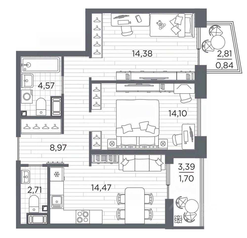 Продается 2-комн. квартира с предчистовой отделкой в ЖК "RESPECT" на 7 этаже. Общая площадь: 61.74 кв.м., жилая: 28.48 кв.м., площадь просторной кухни-столовой: 14.47 кв.м. Комнаты изолированные, все окна выходят на одну сторону. В квартире один балкон и одна лоджия, один совмещенный и один раздельный санузел. Высота потолков 2.7 м.