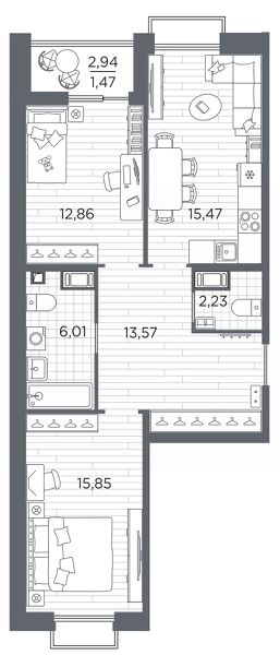 Двухкомнатная квартира от застройщика с предчистовой отделкой в ЖК "RESPECT" на 7 этаже. Общая площадь: 67.46 кв.м., жилая: 28.71 кв.м., площадь просторной кухни-столовой: 15.47 кв.м. Квартира - распашонка, без проходных комнат, окна выходят на paзные стороны дома. В квартире одна лоджия, один совмещенный и один раздельный санузел. Высота потолков 2.7 м.