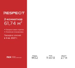 Продается 2-комн. квартира с предчистовой отделкой в ЖК "RESPECT" на 11 этаже. Общая площадь: 61.74 кв.м., жилая: 28.48 кв.м., площадь просторной кухни-столовой: 14.47 кв.м. Комнаты изолированные, все окна выходят на одну сторону. В квартире один балкон и одна лоджия, один совмещенный и один раздельный санузел. Высота потолков 2.7 м.