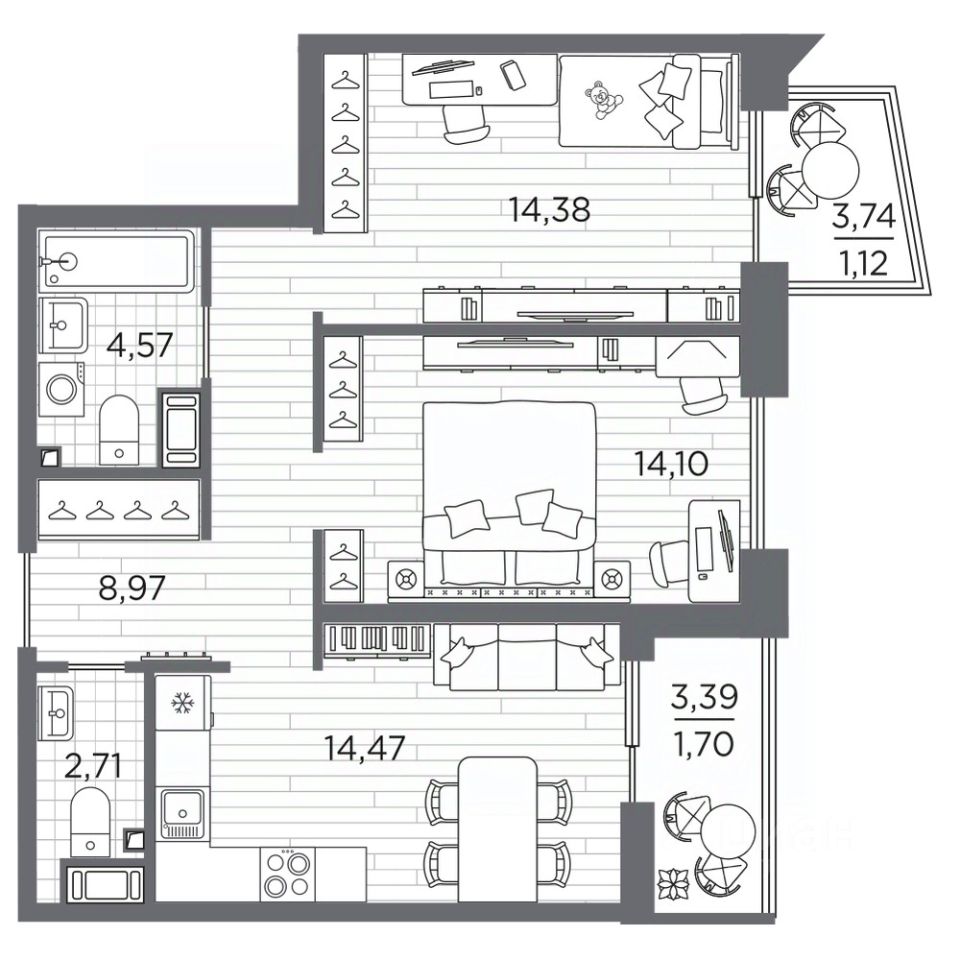 Просторная 2-комн. квартира с предчистовой отделкой в ЖК "RESPECT" на 12 этаже. Общая площадь: 62.02 кв.м., жилая: 28.48 кв.м., площадь просторной кухни-столовой: 14.47 кв.м. Комнаты изолированные, все окна выходят на одну сторону. В квартире один балкон и одна лоджия, один совмещенный и один раздельный санузел. Высота потолков 2.7 м.