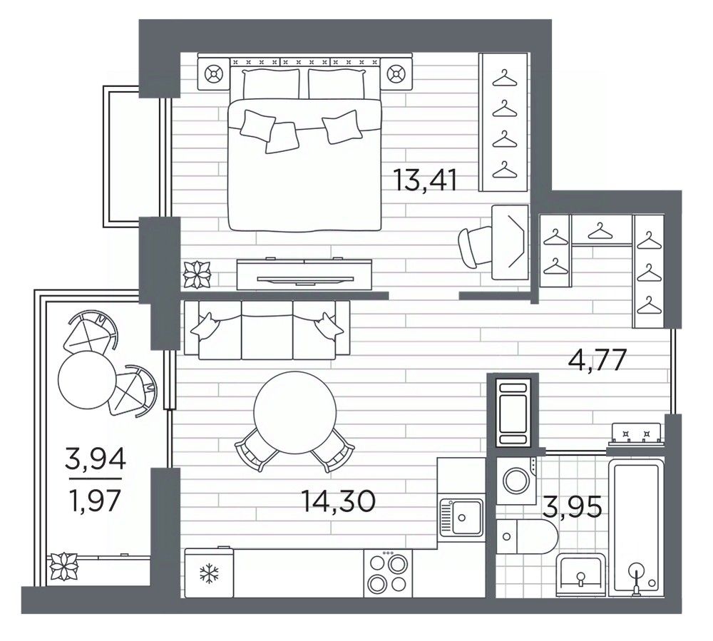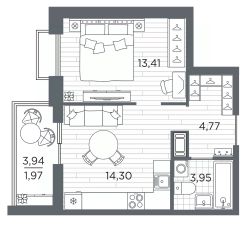 1-комн. квартира с предчистовой отделкой в ЖК "RESPECT" на 3 этаже. Общая площадь: 38.4 кв.м., жилая: 13.41 кв.м., площадь просторной кухни-столовой: 14.3 кв.м. Все окна выходят на одну сторону. В квартире один балкон, один совмещенный санузел. Высота потолков 2.7 м.