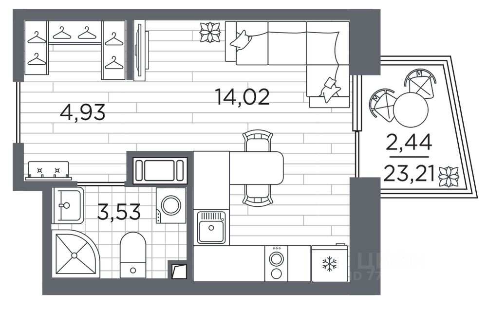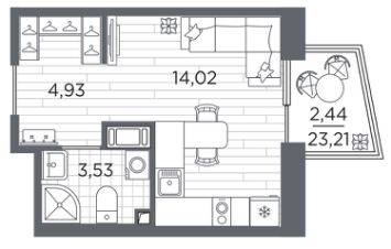 Продается 1-комн. квартира-студия от застройщика с предчистовой отделкой в ЖК "RESPECT" на 7 этаже. Общая площадь: 23.21 кв.м., площадь гостиной 14.02 кв.м., из которых 5 кв.м. выделено под кухонную зону. Все окна выходят на одну сторону. В квартире один балкон, один совмещенный санузел. Высота потолков 2.7 м.