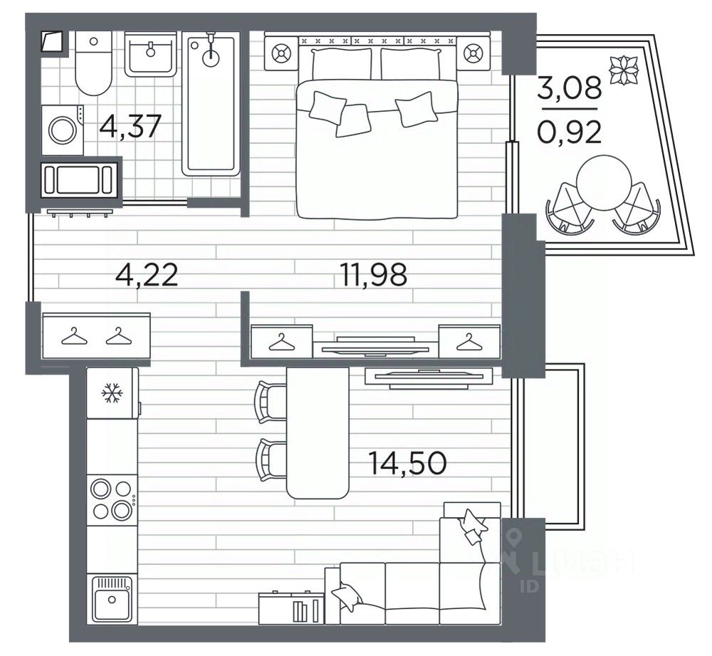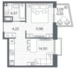 Просторная однокомнатная квартира с предчистовой отделкой в ЖК "RESPECT" на 7 этаже. Общая площадь: 35.99 кв.м., жилая: 11.98 кв.м., площадь просторной кухни-столовой: 14.5 кв.м. Все окна выходят на одну сторону. В квартире один балкон, один совмещенный санузел. Высота потолков 2.7 м.