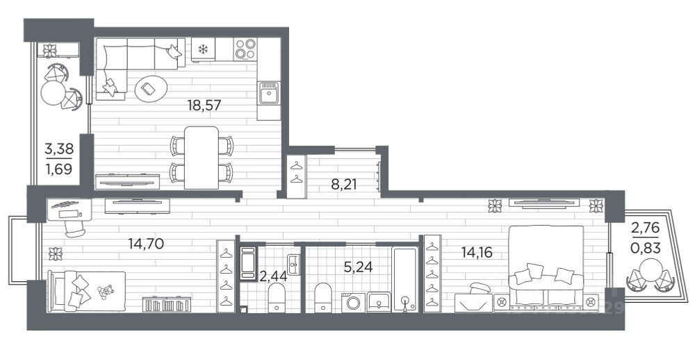 Просторная двухкомнатная квартира с предчистовой отделкой в ЖК "RESPECT" на 11 этаже. Общая площадь: 65.84 кв.м. Высота потолков 2.7 м.