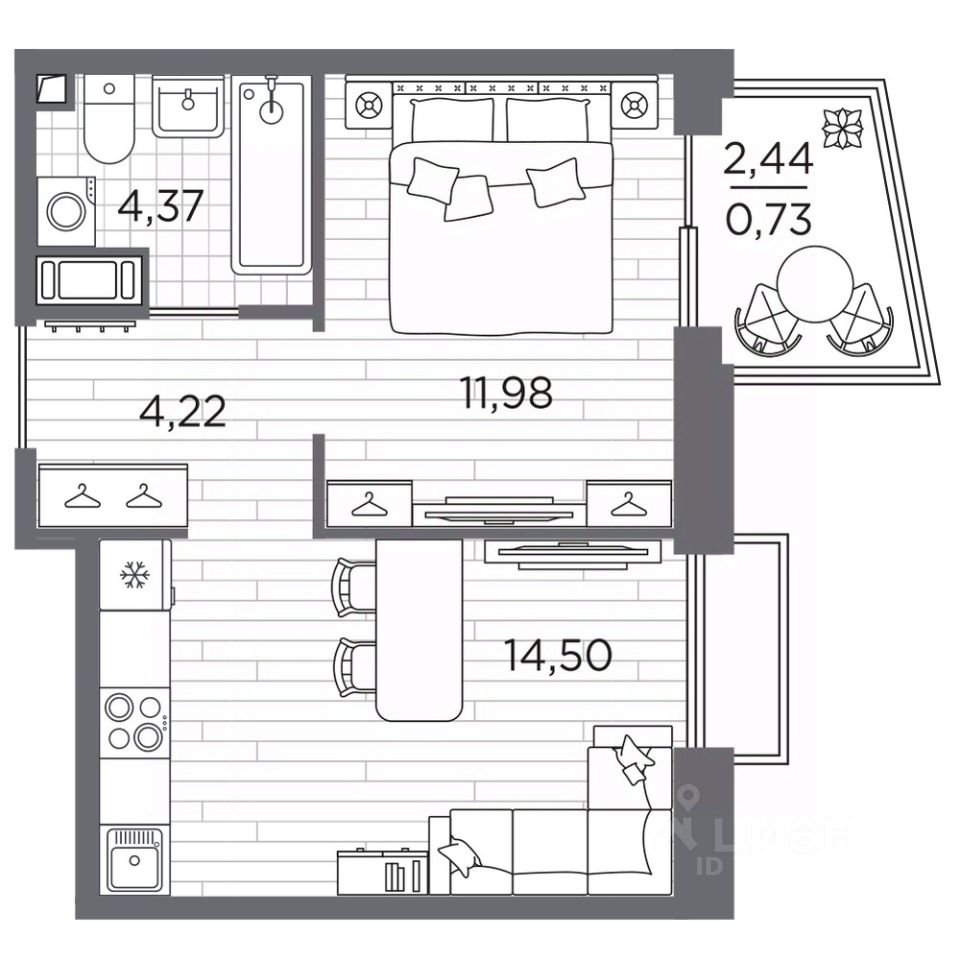 Продается однокомнатная квартира с предчистовой отделкой в ЖК "RESPECT" на 12 этаже. Общая площадь: 35.8 кв.м., жилая: 11.98 кв.м., площадь просторной кухни-столовой: 14.5 кв.м. Все окна выходят на одну сторону. В квартире один балкон, один совмещенный санузел. Высота потолков 2.7 м.