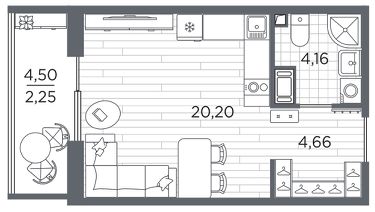 Просторная 1-комн. квартира-студия с предчистовой отделкой в ЖК "RESPECT" на 3 этаже. Общая площадь: 31.27 кв.м., площадь гостиной 20.2 кв.м., из которых 5 кв.м. выделено под кухонную зону. Все окна выходят на одну сторону. В квартире один балкон, один совмещенный санузел. Высота потолков 2.7 м.