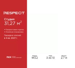 Продается 1-комн. квартира-студия от застройщика с предчистовой отделкой в ЖК "RESPECT" на 3 этаже. Общая площадь: 31.27 кв.м., площадь гостиной 20.2 кв.м., из которых 5 кв.м. выделено под кухонную зону. Все окна выходят на одну сторону. В квартире один балкон, один совмещенный санузел. Высота потолков 2.7 м.