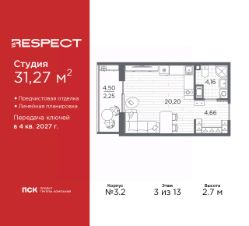 1-комн. квартира-студия с предчистовой отделкой в ЖК "RESPECT" на 3 этаже. Общая площадь: 31.27 кв.м., площадь гостиной 20.2 кв.м., из которых 5 кв.м. выделено под кухонную зону. Все окна выходят на одну сторону. В квартире один балкон, один совмещенный санузел. Высота потолков 2.7 м.