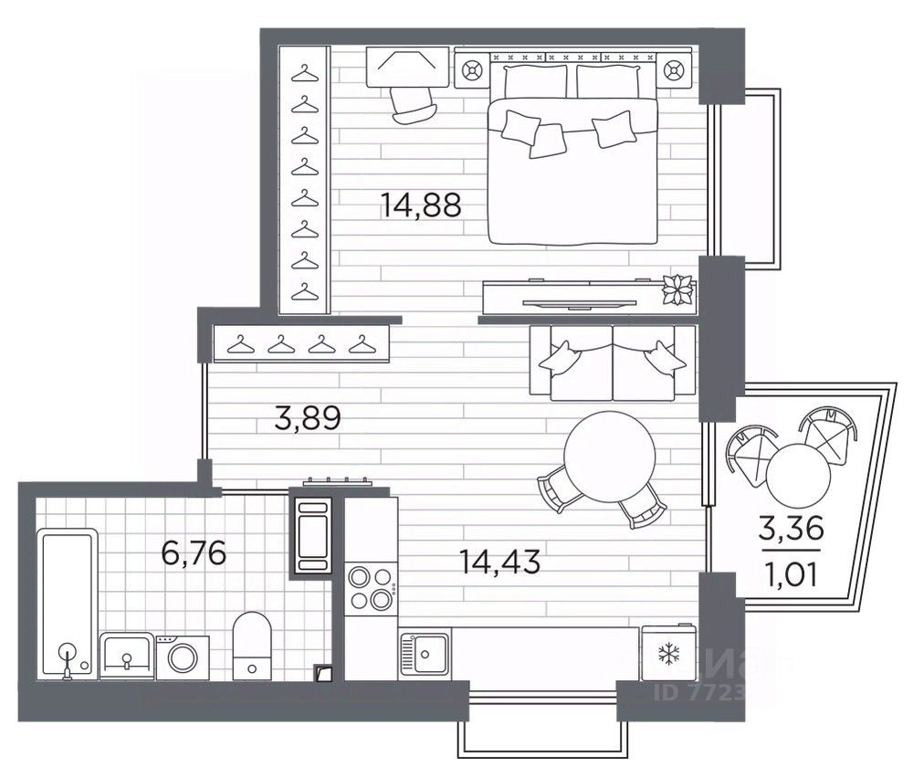 Однокомнатная квартира с предчистовой отделкой в ЖК "RESPECT" на 7 этаже. Общая площадь: 40.97 кв.м., жилая: 14.88 кв.м., площадь просторной кухни-столовой: 14.43 кв.м. Квартира угловая, идеально подойдет любителям тишины и панорамных видов. В квартире один балкон, один совмещенный санузел. Высота потолков 2.7 м.