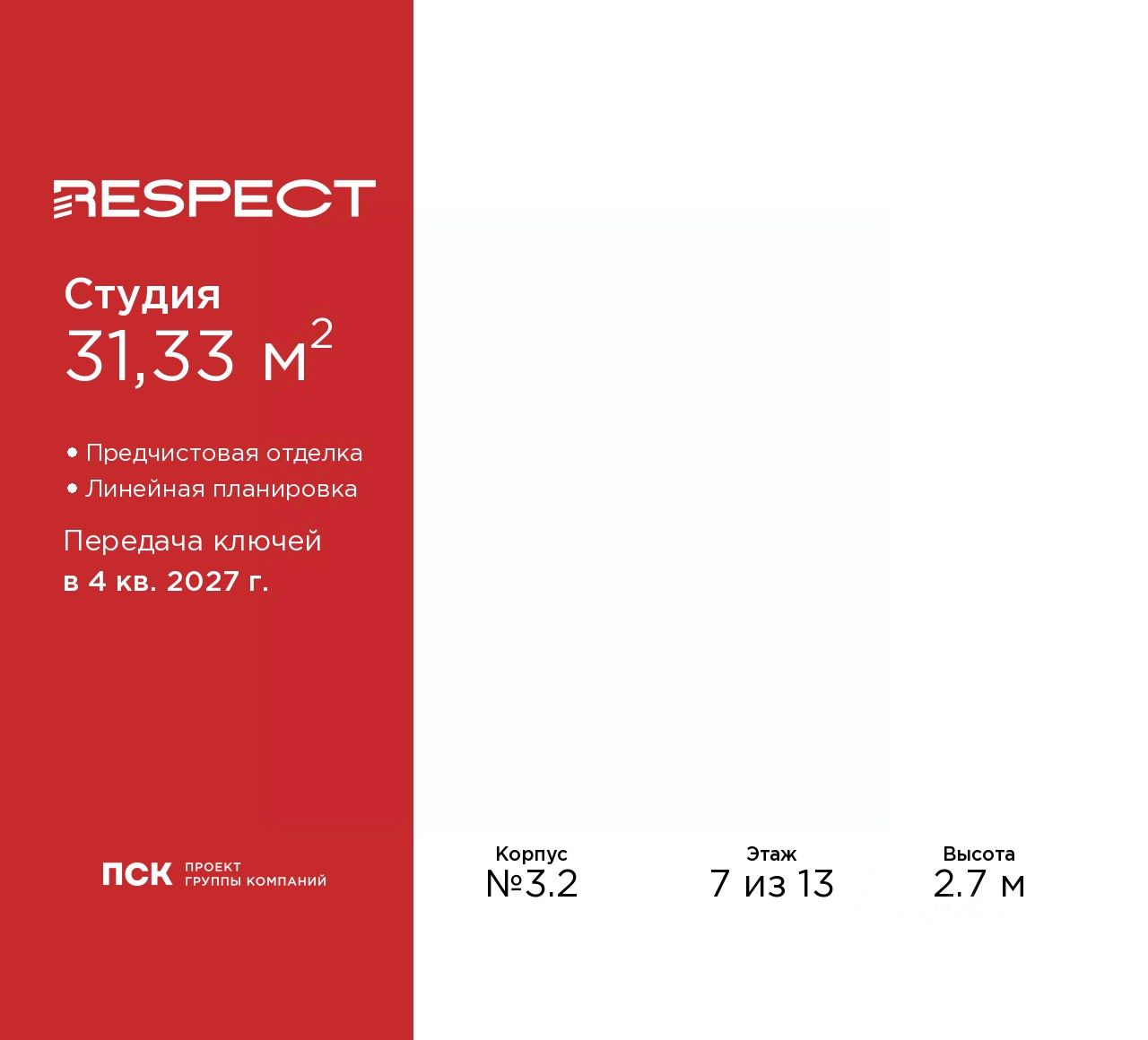 Продается однокомнатная квартира-студия с предчистовой отделкой в ЖК "RESPECT" на 7 этаже. Общая площадь: 31.33 кв.м., площадь гостиной 20.2 кв.м., из которых 5 кв.м. выделено под кухонную зону. Все окна выходят на одну сторону. В квартире один балкон, один совмещенный санузел. Высота потолков 2.7 м.