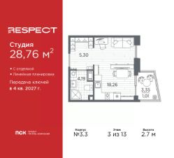 Просторная 1-комн. квартира-студия с отделкой в ЖК "RESPECT" на 3 этаже. Общая площадь: 28.76 кв.м., площадь гостиной 18.26 кв.м., из которых 5 кв.м. выделено под кухонную зону. Все окна выходят на одну сторону. В квартире один балкон, один совмещенный санузел. Высота потолков 2.7 м.