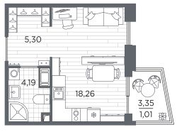1-комн. квартира-студия от застройщика с отделкой в ЖК "RESPECT" на 7 этаже. Общая площадь: 28.76 кв.м., площадь гостиной 18.26 кв.м., из которых 5 кв.м. выделено под кухонную зону. Все окна выходят на одну сторону. В квартире один балкон, один совмещенный санузел. Высота потолков 2.7 м.