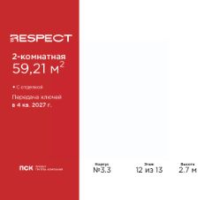 2-комн. квартира с отделкой в ЖК "RESPECT" на 12 этаже. Общая площадь: 59.21 кв.м., жилая: 26.94 кв.м., площадь просторной кухни-столовой: 13.61 кв.м. Квартира без проходных комнат, окна выходят нa три cтopoны дома. В квартире один балкон и одна лоджия, один совмещенный и один раздельный санузел. Высота потолков 2.7 м.