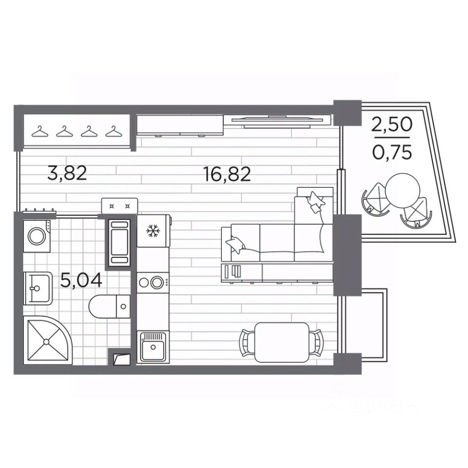 Продается однокомнатная квартира-студия с отделкой в ЖК "RESPECT" на 4 этаже. Общая площадь: 26.43 кв.м., площадь гостиной 16.82 кв.м., из которых 5 кв.м. выделено под кухонную зону. Все окна выходят на одну сторону. В квартире один балкон, один совмещенный санузел. Высота потолков 2.7 м.