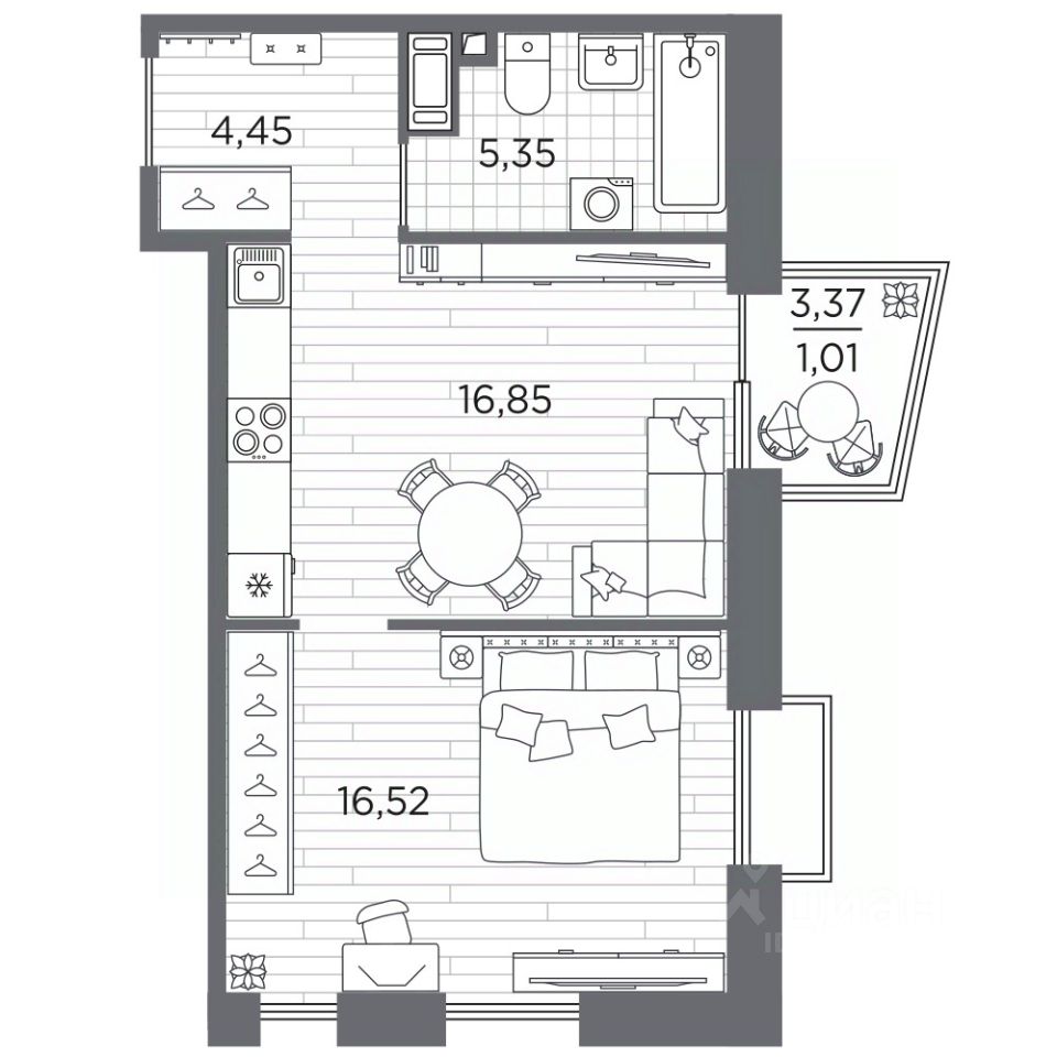 Продается однокомнатная квартира с отделкой в ЖК "RESPECT" на 8 этаже. Общая площадь: 44.18 кв.м., жилая: 16.52 кв.м., площадь просторной кухни-столовой: 16.85 кв.м. Угловая квартира, идеально подойдет любителям тишины и панорамных видов. В квартире один балкон, один совмещенный санузел. Высота потолков 2.7 м.