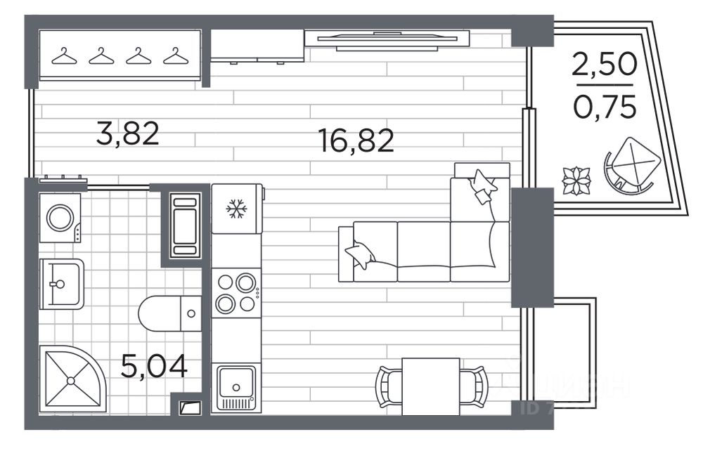 1-комн. квартира-студия с отделкой в ЖК "RESPECT" на 12 этаже. Общая площадь: 26.43 кв.м. Высота потолков 2.7 м.