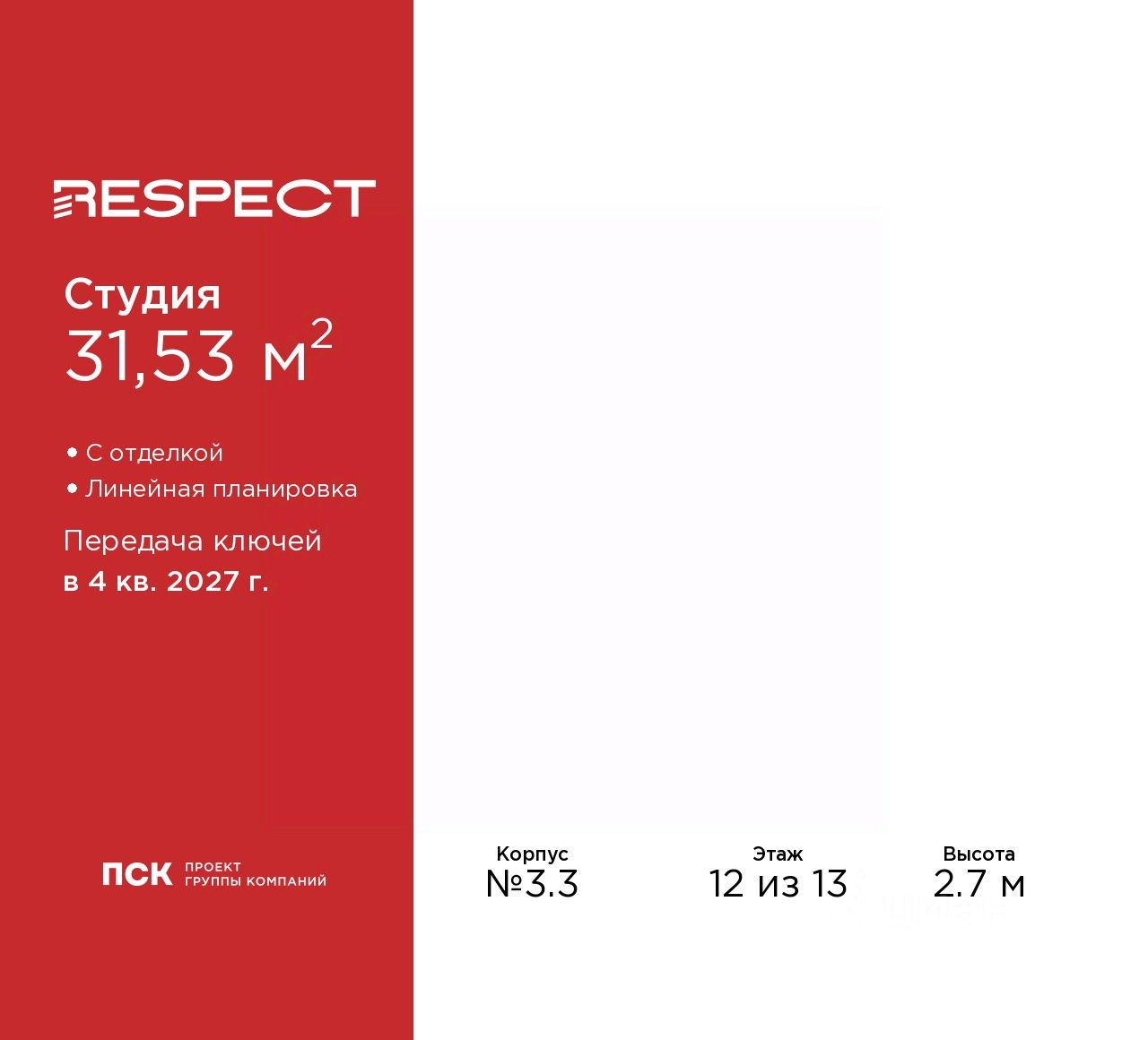 Продается однокомнатная квартира-студия от застройщика с отделкой в ЖК "RESPECT" на 12 этаже. Общая площадь: 31.53 кв.м., площадь гостиной 23 кв.м., из которых 5 кв.м. выделено под кухонную зону. Все окна выходят на одну сторону. В квартире одна лоджия, один совмещенный санузел. Высота потолков 2.7 м.
