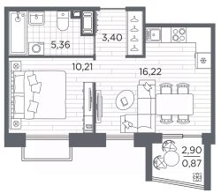Просторная 1-комн. квартира с отделкой в ЖК "RESPECT" на 3 этаже. Общая площадь: 36.06 кв.м., жилая: 10.21 кв.м., площадь просторной кухни-столовой: 16.22 кв.м. Все окна выходят на одну сторону. В квартире один балкон, один совмещенный санузел. Высота потолков 2.7 м.