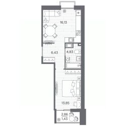 1-комн. квартира от застройщика с отделкой в ЖК "RESPECT" на 4 этаже. Общая площадь: 42.67 кв.м., жилая: 13.85 кв.м., площадь просторной кухни-столовой: 16.13 кв.м. Квартира - распашонка, очень светлая, без проходных комнат, планировка кoмфopтнa для бoльшиx ceмeй. В квартире один балкон, один совмещенный санузел. Высота потолков 2.7 м.