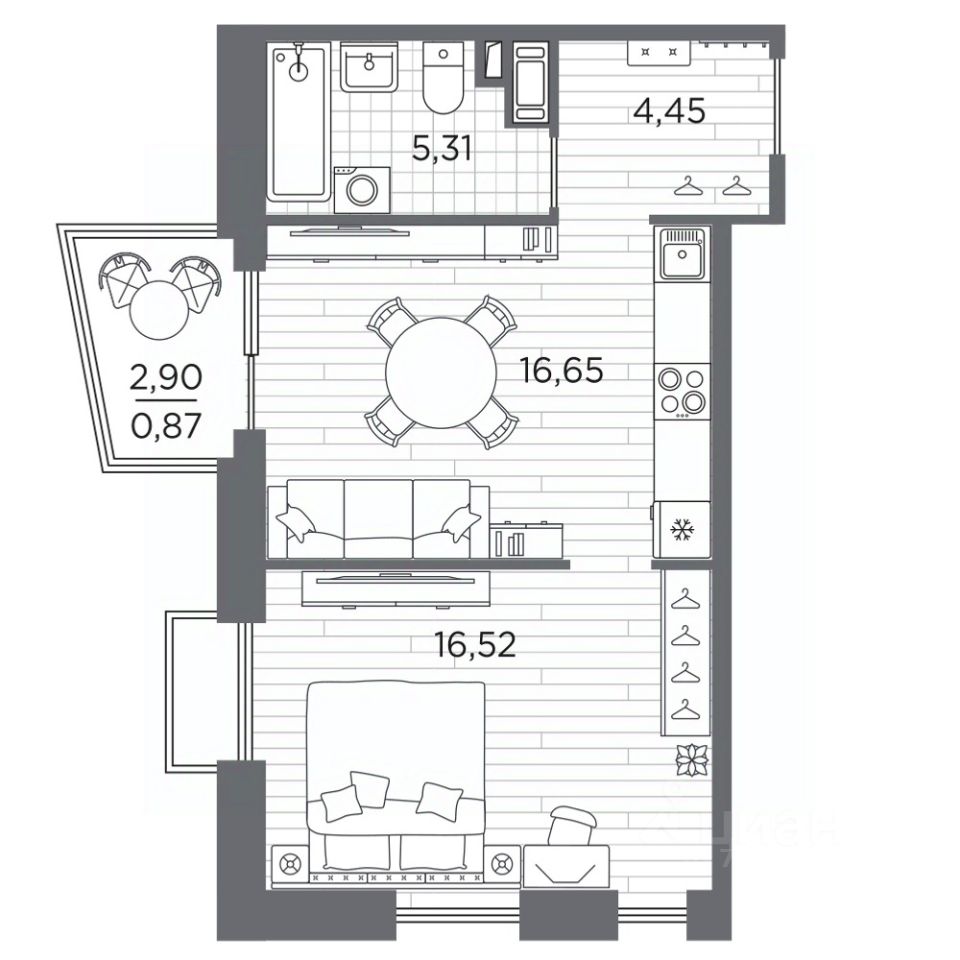 1-комн. квартира с отделкой в ЖК "RESPECT" на 4 этаже. Общая площадь: 43.8 кв.м., жилая: 16.52 кв.м., площадь просторной кухни-столовой: 16.65 кв.м. Угловая квартира, очень светлая, естественная вентиляция при открытии окон. В квартире один балкон, один совмещенный санузел. Высота потолков 2.7 м.