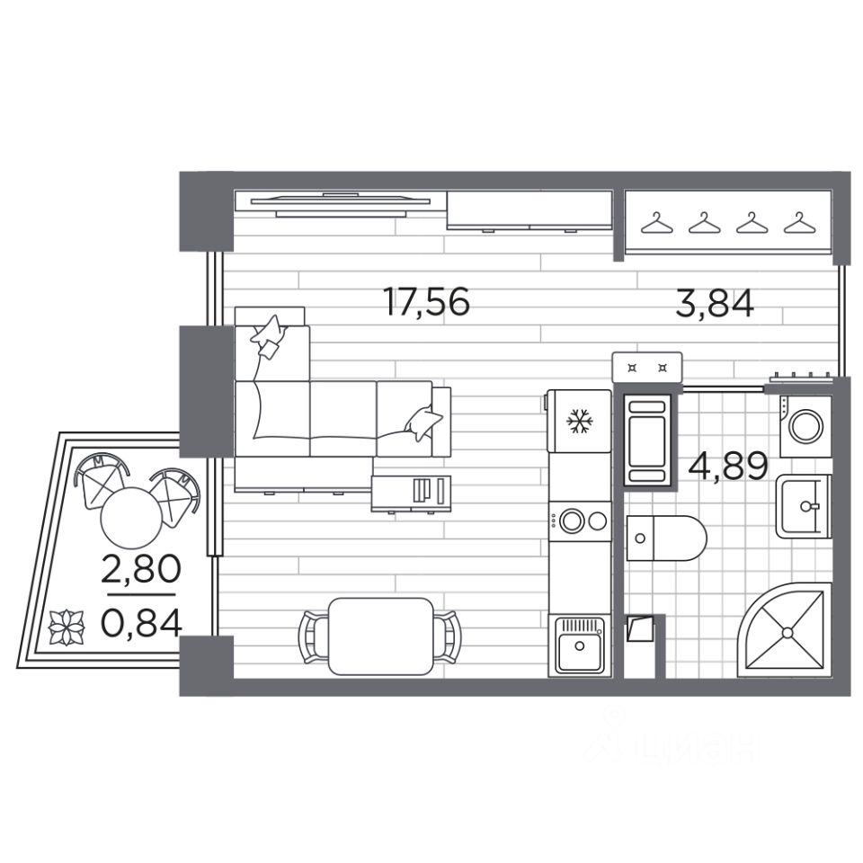 Продается однокомнатная квартира-студия с отделкой в ЖК "RESPECT" на 4 этаже. Общая площадь: 27.13 кв.м., площадь гостиной 17.56 кв.м., из которых 5 кв.м. выделено под кухонную зону. Все окна выходят на одну сторону. В квартире один балкон, один совмещенный санузел. Высота потолков 2.7 м.