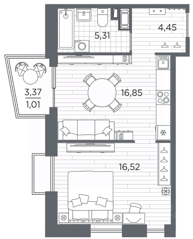 Однокомнатная квартира с отделкой в ЖК "RESPECT" на 7 этаже. Общая площадь: 44.14 кв.м., жилая: 16.52 кв.м., площадь просторной кухни-столовой: 16.85 кв.м. Квартира угловая, идеально подойдет любителям тишины и панорамных видов. В квартире один балкон, один совмещенный санузел. Высота потолков 2.7 м.