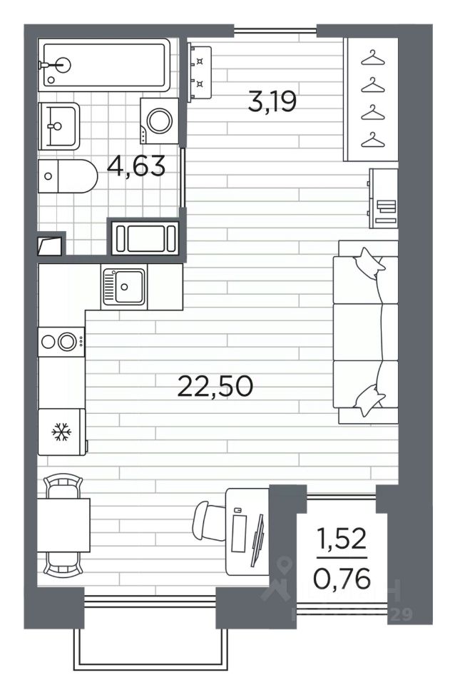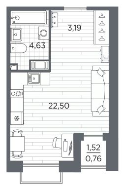 1-комн. квартира-студия от застройщика с отделкой в ЖК "RESPECT" на 11 этаже. Общая площадь: 31.08 кв.м., площадь гостиной 22.5 кв.м., из которых 5 кв.м. выделено под кухонную зону. Все окна выходят на одну сторону. В квартире одна лоджия, один совмещенный санузел. Высота потолков 2.7 м.